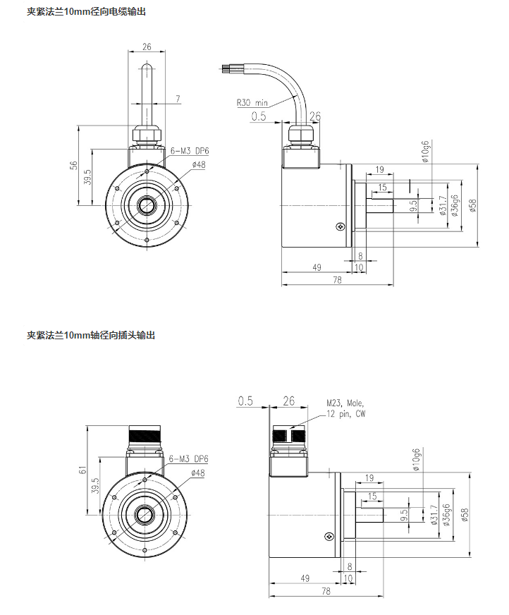雷恩RCI58系列编码器提供10mm标准轴径与6mm、8mm、9mm可选规格,满足从大型起重机齿轮箱到精密木材加工机械的传动接口需求。实心轴设计配合双轴承结构,在承受径向负载的同时,保持0.01mm的轴向跳动精度,确保长期运行的稳定性。